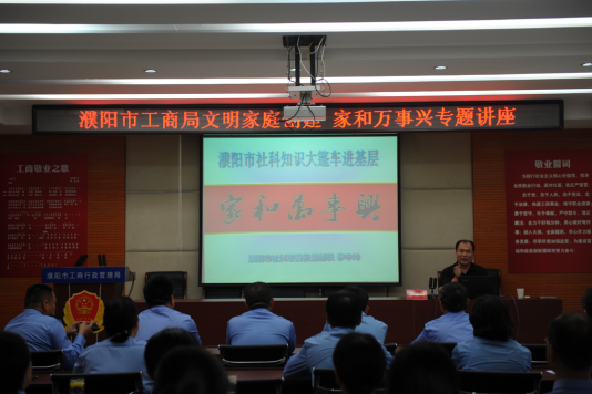 2016年9月29日,濮阳市社科知识大篷车进基层活动在濮阳市工商局机关会议室举办文明家庭创建专题讲座。濮阳市社科联普及部部长、濮阳职业技术学院工商管理系特聘教授、濮阳市图书馆理事会成员、濮阳市心理学会讲师团名誉团长李中坤亲自登台,以《家和万事兴》为题做了精彩的授课。这次讲座由濮阳市工商局文明办、机关党委、工会、妇委会联合承办,来自濮阳市工商局机关各科室、支队、分局的60人参加讲座。