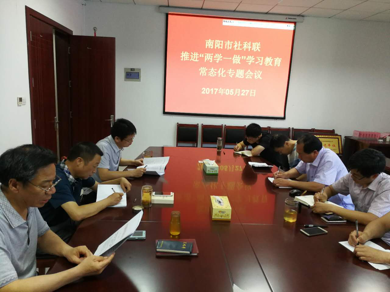 5月27日,南阳市社科联召开推进“两学一做”学习教育常态化专题会议。党组书记、副主席石峰主持会议,机关全体同志参加。会议传达了市委关于“两学一做”的安排部署,宣读了南阳市社科联《关于在机关推进“两学一做”学习教育常态化制度化的实施方案》。