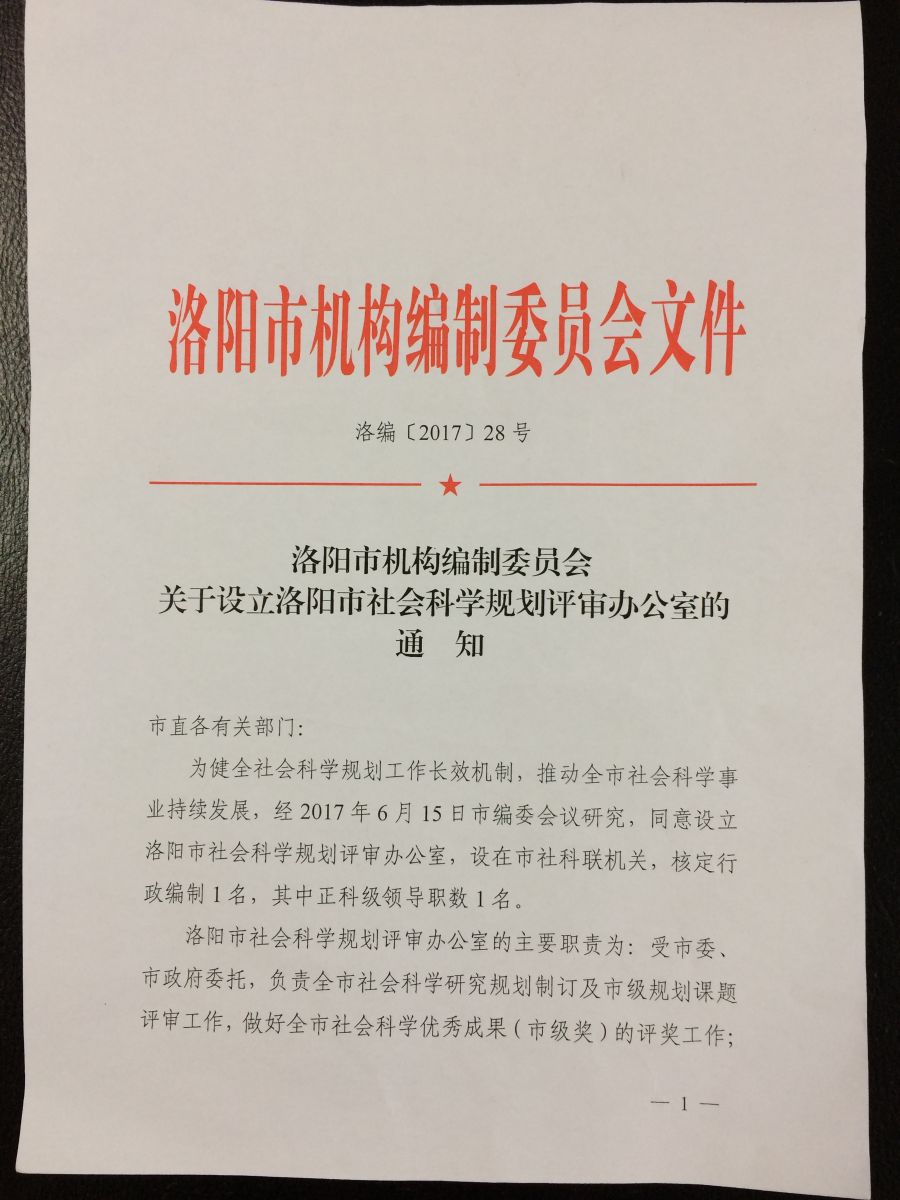 日前,洛阳市机构编制委员会印发通知,同意设立洛阳市社会科学规划评审办公室,作为常设办事机构,设在洛阳市社科联机关。