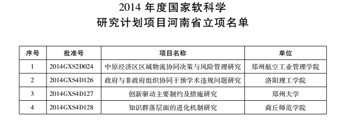 2014年度国家软科学研究计划项目河南省立项名单