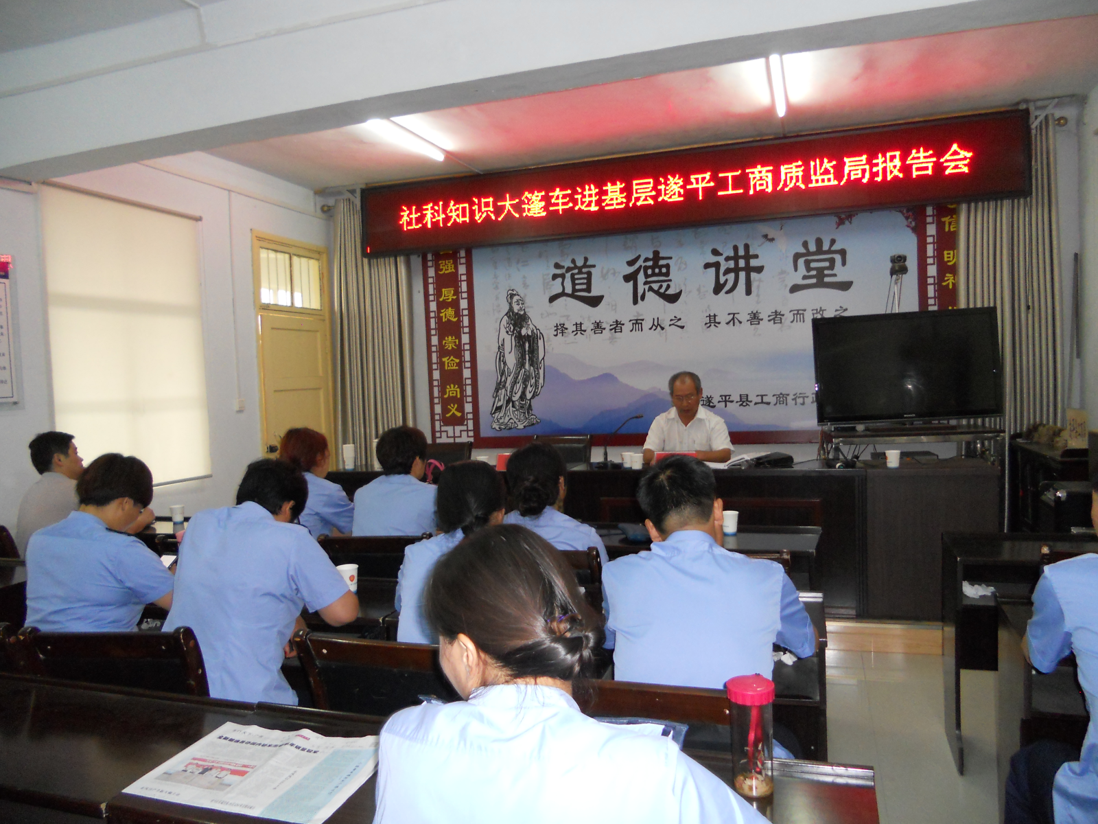 9月19日下午,驻马店市遂平县社科联邀请中国管理科学研究院特约研究员、驻马店市作协会员王万江老师,到遂平县工商质监局以“家训 家之根 国之本”为主题,为该局全体人员做了一场“传统家训”报告会。