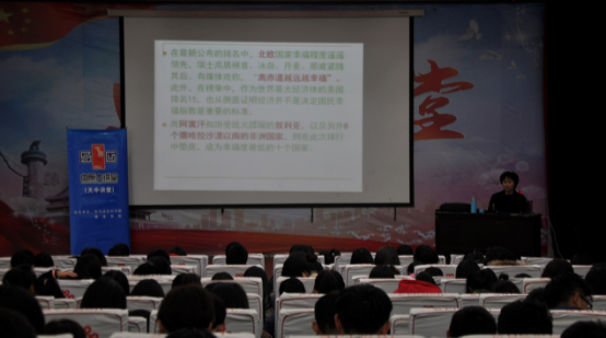 伴随着殷秀梅的一首《幸福在哪里》音乐播放完毕,秦教授首先给参加报告会的大学生提出了这们一个问题:“大学生,今天的你幸福吗?”,并随机进行了摸底调查,引出了什么是幸福,当代大学生如何追求幸福的问题。接着,用大量的数据对哪些国家幸福、哪些城市幸福、哪些人幸福、进行了对比分析。最后,对当代大学生幸福感缺失的原因进行了分析及幸福感的培养进行了重点讲解。