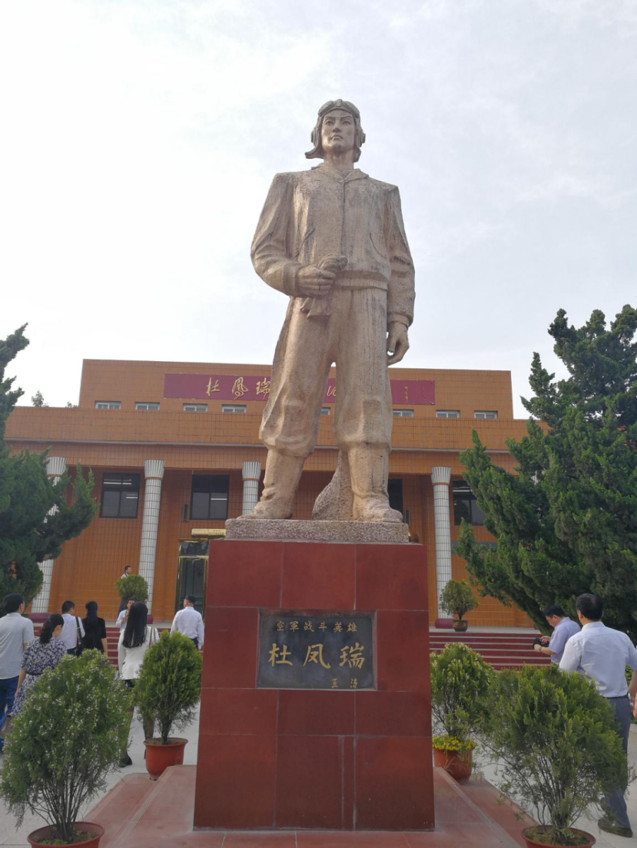 杜凤瑞烈士纪念馆位于方城县城东北3公里,占地3875平方米,建筑面积340平方米,为河南省爱国主义教育基地。跟随解说员的讲解,大家仔细观看每一份文件、每一件遗物、每一个简介,敬佩于杜凤瑞同志为了革命理想废寝忘食学习飞行知识、实现从零基础到顶尖优秀学员的顽强与坚持,为了保卫国家领空单机冲入敌人机群、最终在战斗中不幸牺牲的大无畏精神。