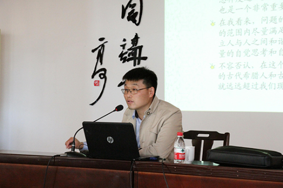 此次讲座邀请南阳师范学院文史学院历史学博士韩涛主讲。韩涛毕业于陕西师范大学历史学院,博士主攻方向是儒学,先后多次参加海内外学术交流。他从“仁”字出发,从外延到内涵,仁爱的超越,推演推己及人,联系当下“社区文化”的新内涵,教化大家处理人与人之间的关系,从而实现社区和谐。