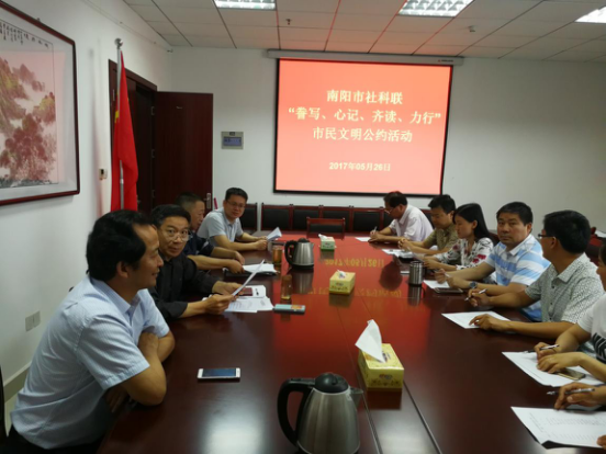 为培育和践行社会主义核心价值观,弘扬健康向上的社会风尚,营造争当文明个人、建设文明单位的良好氛围,5月26日,南阳市社科联开展“誊写、心记、齐读、力行《南阳市市民文明公约》”活动,机关全体同志参加。