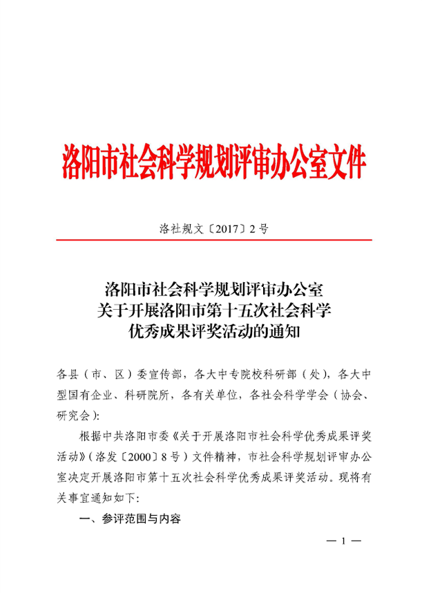 本次评奖活动奖项设一、二、三等奖,获奖成果作者获得“洛阳市社会科学优秀成果获奖证书”和奖金,可作为考核、晋升职称的参考。