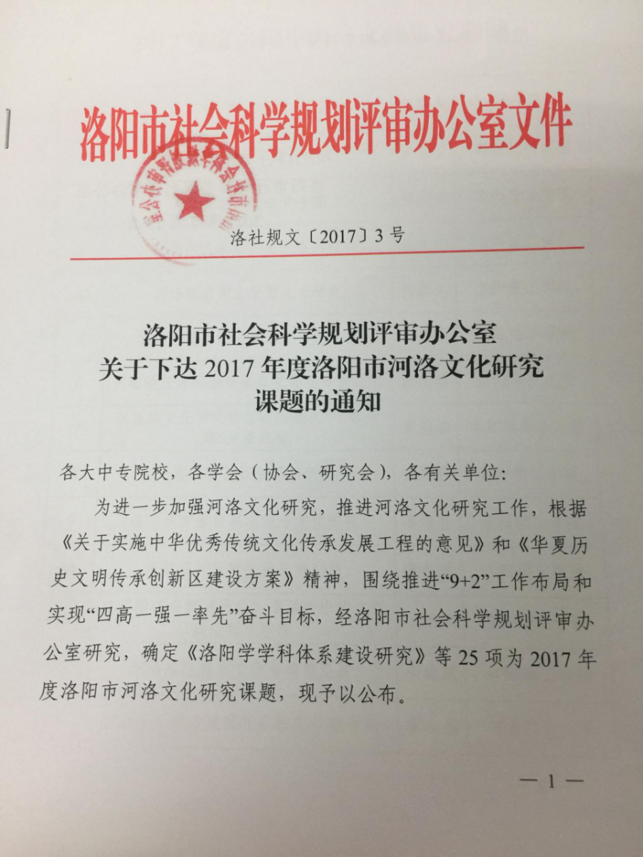 日前,为进一步推进河洛文化研究工作,根据中央、省《关于实施中华优秀传统文化传承发展工程的意见》和《华夏历史文明传承创新区建设方案》等文件精神,围绕洛阳市加快推进“9+2”工作布局和实现“四高一强一率先”奋斗目标,为河南省加快构筑全国重要文化高地提供理论支持和智力支撑,经洛阳市社会科学规划评审办公室研究,确定《洛阳学学科体系建设研究》等25项为2017年度洛阳市河洛文化研究课题。