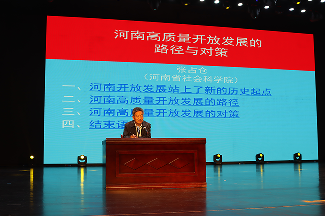 张占仓在报告中指出,进入新时代,河南改革开放站在了新的历史起点。新时代推动河南经济高质量发展,要着力打好产业结构优化升级、创新驱动发展、新型城镇化、基础能力建设“四张牌”,努力在区域创新政策上实现新突破,加强创新开放合作,深入推进供给侧结构性改革,扎实推进贸易强省建设,推进国际金融资本与产业资本有效对接。要推动郑州航空港经济综合实验区、郑洛新国家自主创新示范区、中国(河南)自贸试验区、中国(郑州)跨境电子商务综合试验区和中国(河南)大数据综合试验区“五区联动”,实施开放平台持续提升工程;要把握空中、陆上、网上、海上丝绸之路“四路”协同,实施开放通道拓展升级工程;要加大招商力度,实施利用外资提质增效工程;要培育外贸主体,实施对外贸易转型发展工程;要强化服务引导,实施“豫企出海”工程;要对标国际标准,实施营商环境优化引领工程。要大力倡导新时代奋斗精神,冷静应对百年未有之大变局,聚焦“五区联动”“四路协同”,在思想开放上下硬功夫,推动中原更加出彩。