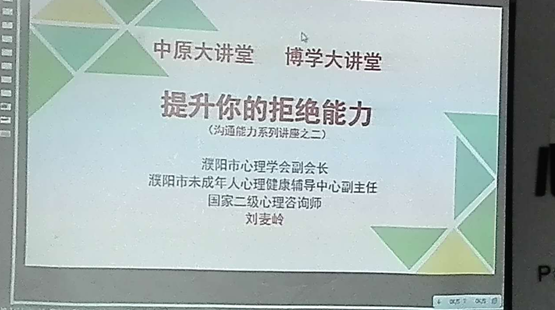 2016年6月29日,濮阳市社科联、濮阳市心理学会、濮阳市未成年人心理健康辅导中心联合在濮阳市综合活动中心三楼报告厅举行心理学专家报告会。濮阳市心理学会副会长、讲师团团长、濮阳市未成年人心理健康辅导中心副主任、国家二级心理咨询师刘麦岭老师担任主讲,做了题为《沟通能力系列讲座之二——提升你的拒绝能力》的精彩报告。濮阳市人大常委会民族宗教侨务外事工作委员会主任王玉蕊、濮阳市社科联普及部部长李中坤、濮阳市心理学会会长张志峰和来自濮阳市、中原油田各个机关企业事业单位的心理学爱好者、机关干部、校长老师、市民群众、学生家长共150多人聆听了这次讲座。濮阳市心理学会讲师团成员臧田田老师主持了这次讲座。