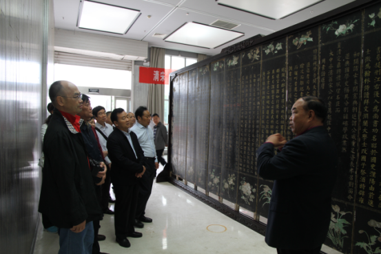刘日知一行首先参观了市博物馆基本陈列《厚重天中》。在参观过程中,代表团一行认真听取了讲解员对陈展内容的讲解,并不时向工作人员交流提问,探讨与文物相关的问题,对市博物馆在展示驻马店发展历史及其文化积累沉淀上所做的工作给予了高度评价,对展览反映的天中厚重文化底蕴给予了充分肯定。代表团一行随后来到临时展厅进行了参观,对回归故乡的镇馆之宝——“清顺治漆器三十六寿屏”表现出极大的兴趣。代表团一行认为,此件文物是难得的艺术珍品,具有鲜明的时代特征和较高的历史研究价值,三组大寿屏气势磅礴,刻工细腻,情节生动,可谓屏风中的皇皇巨制,并对驻马店市博物馆丰富的馆藏及科学的保护、展示手段表示赞赏。最后,刘日知指出,希望市博物馆在今后的工作中,在保护好馆藏文物的同时,履行好博物馆的职责使命,把博物馆打造成弘扬中华优秀传统文化和宣传普及人文社会科学知识的阵地、窗口,提高社会大众的人文社会科学素养。