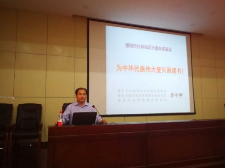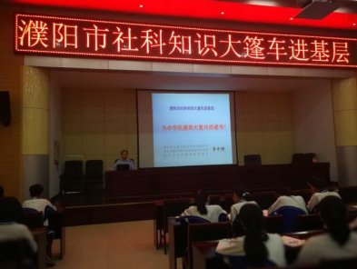5月9日下午,濮阳市社科知识大篷车来到濮阳市第一中学举办全民阅读公益讲座活动。濮阳市社科联普及部部长李中坤做了题为《为中华民族伟大复兴而读书》的精彩讲座。濮阳市第一中学政教科副科长孟捷主持讲座,并对李老师的精彩讲授给予高度评价。200多名初中学生聆听了这次讲座。