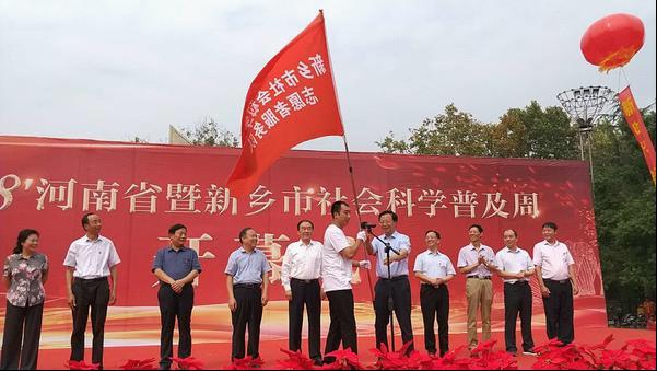 开幕式上,与会领导为新乡市社科普及基地授牌,为社区、扶贫村、社科普及基地代表赠送社科类书籍,为新乡市社科普及志愿者服务队授旗。