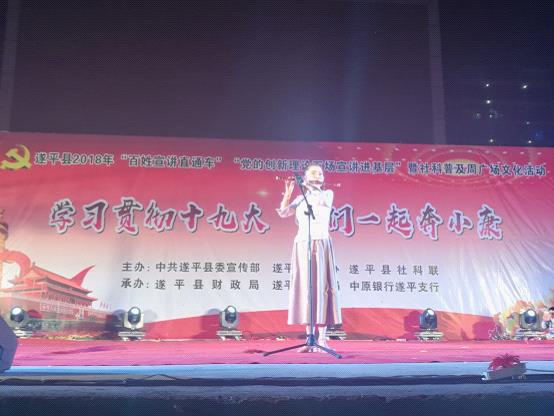 根据《遂平县2018年社科普及周实施方案》活动计划安排,9月14日晚,由遂平县委宣传部、县社科联主办,县财政局、县人社局、中原银行遂平支行承办的广场文化演出活动在遂平县文化艺术中心广场隆重上演。